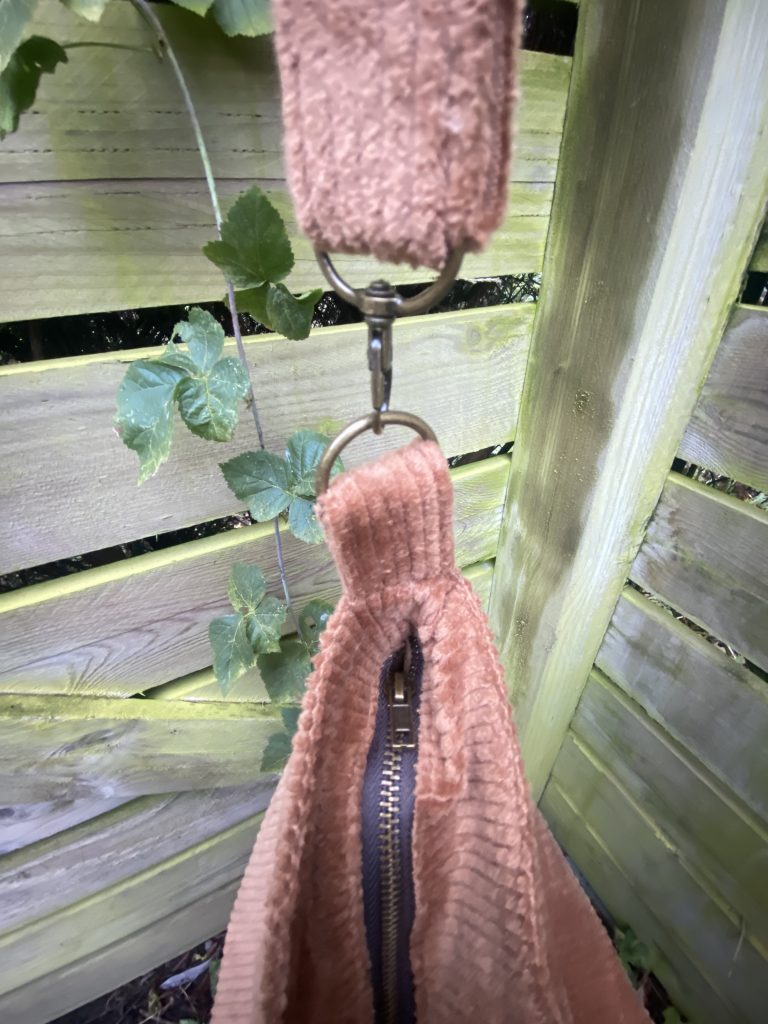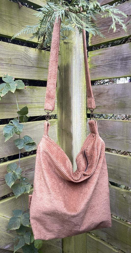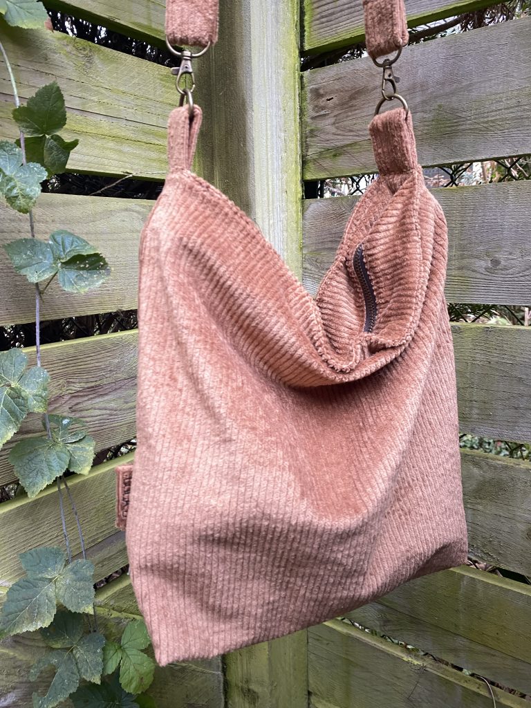 Sac tendance bohème en velours Brun Fauve avec une anse de 95 cm fermé par une fermeture éclair de 35 cm.