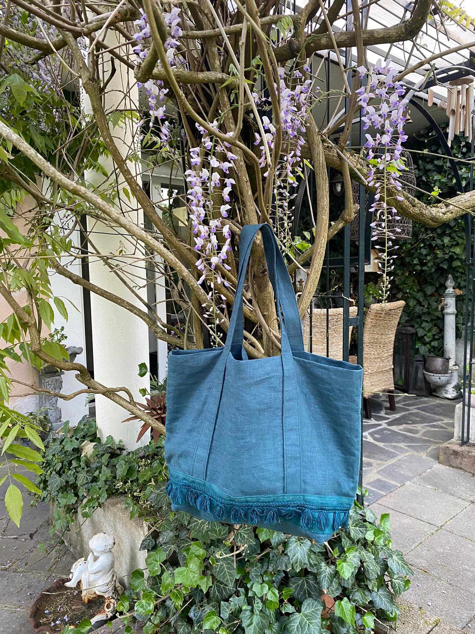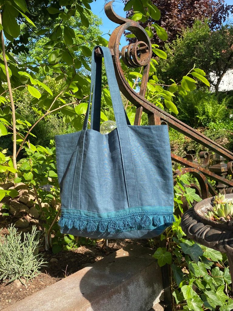 Sac cabas lin pétrole orné d’un galon assorti