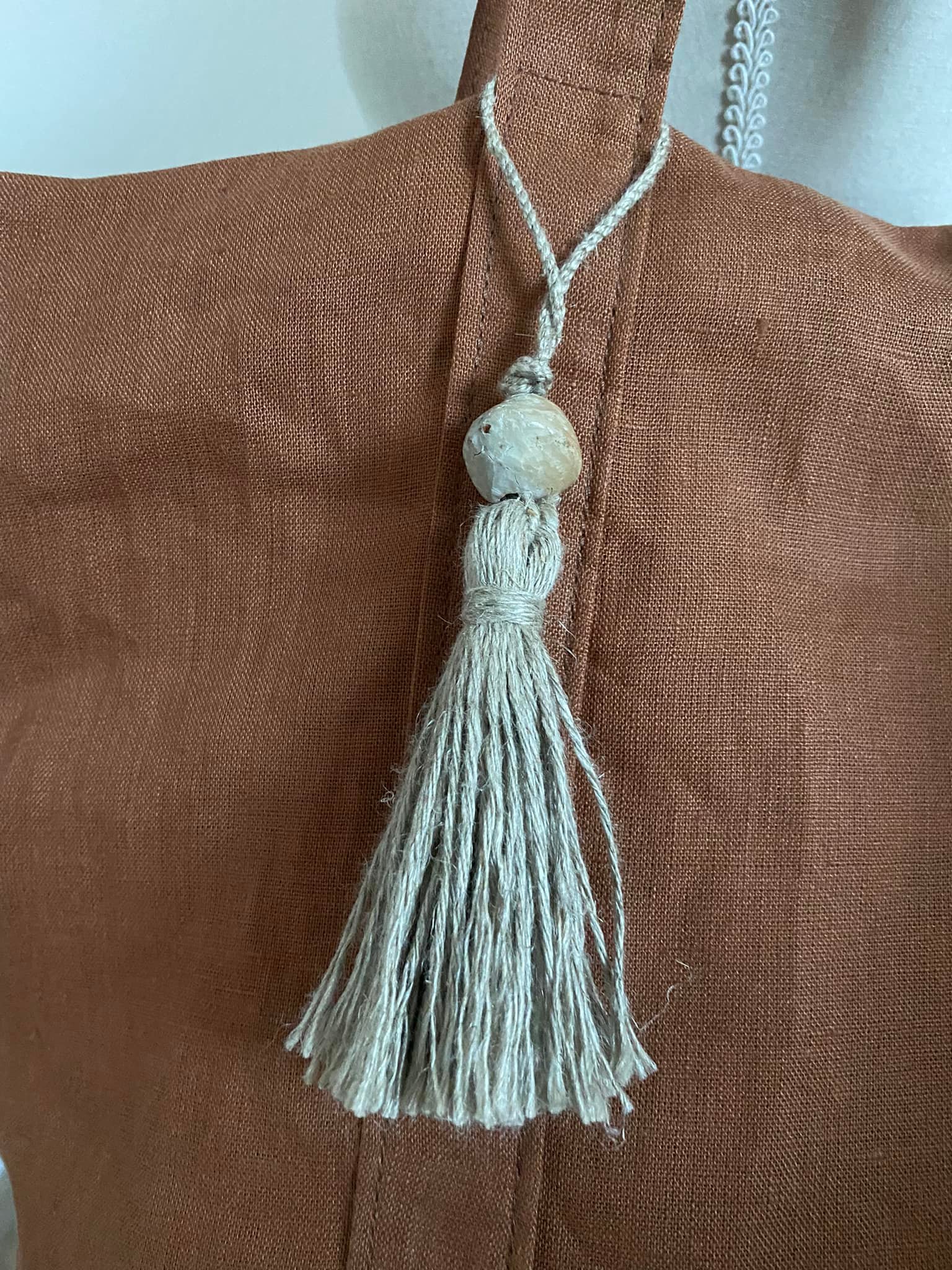 Sac cabas lin de couleur terracotta orné d’un galon naturel en toile de jute.